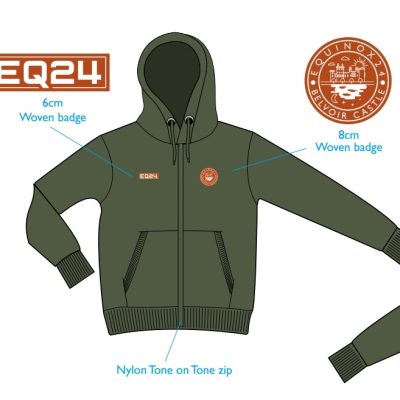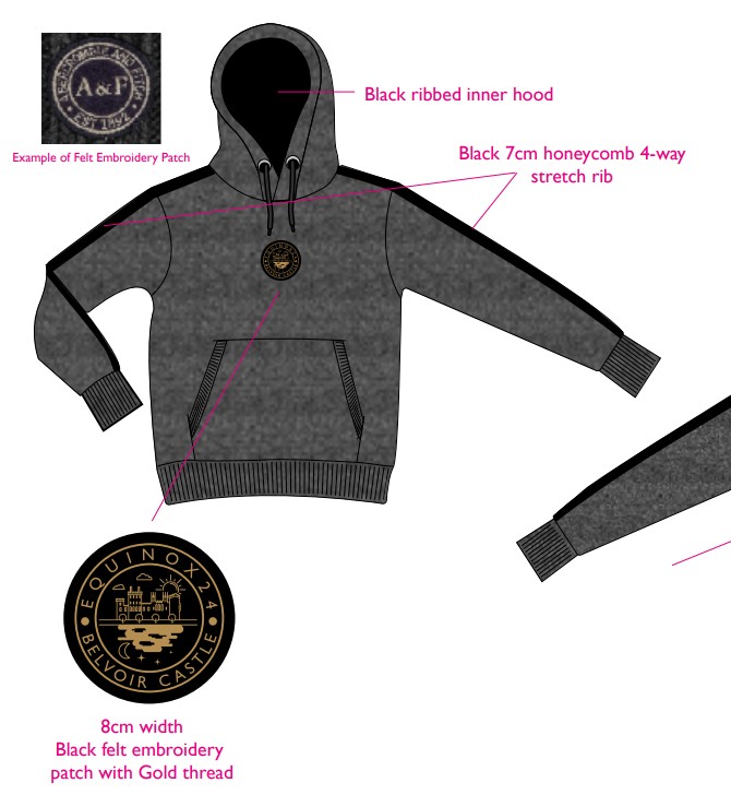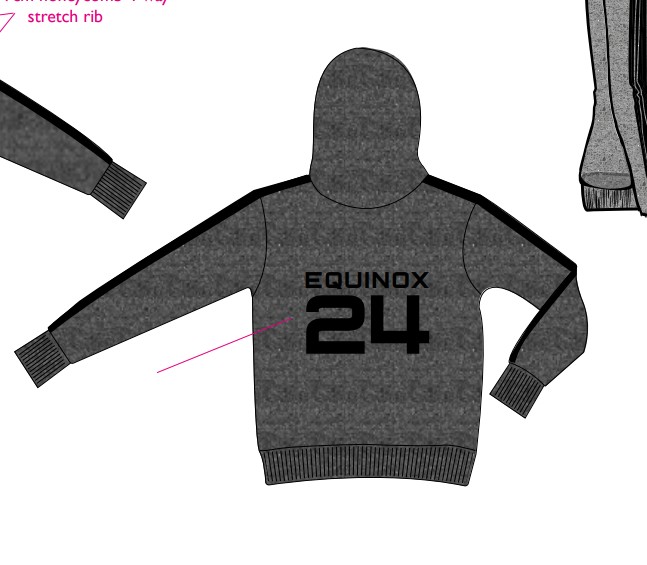 Pullover hoody in graphite with black stripe to sleeves, embroidered Equinox24 badge to the front, and printed design to the rear.