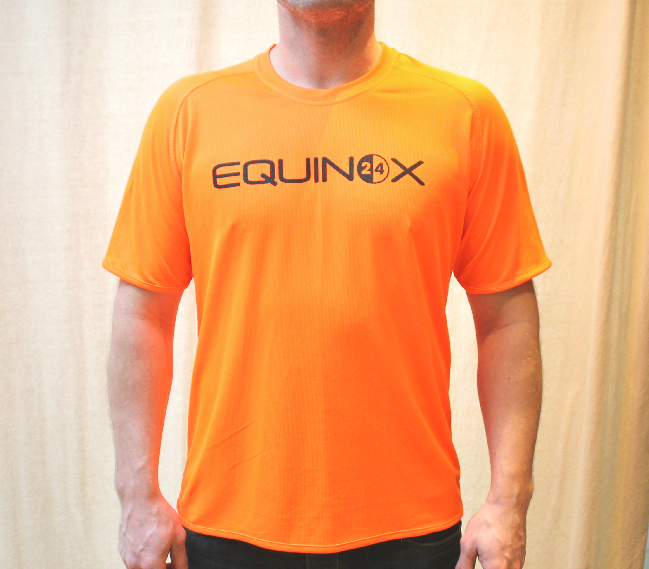 Bright orange technical t-shirt with Equinox24 to the front chest and ‘In Training for Equinox24’ to the rear back and #ONEMORELAP at the bottom.